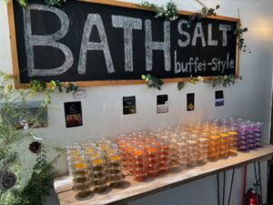アメニティは昨今流行りの必要な分持っていって形式。バスソルトもカラフルに陳列されています。