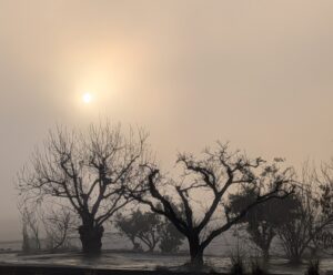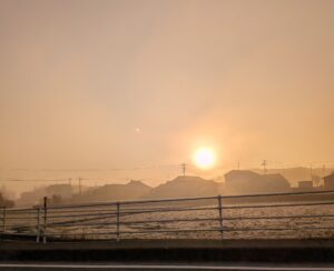 山の中を進むにつれ、朝もやが広がり、太陽の輪郭をとらえることができます。