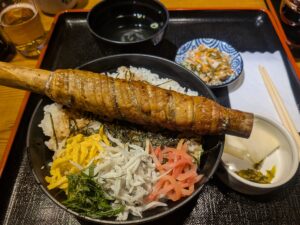 私は【太刀魚ちりめん丼】(1980円)を注文。竹に巻かれた太刀魚が立派。かじりついてもいいし、解して混ぜ混ぜしてもいいし。とても香ばしくて美味しかったです!