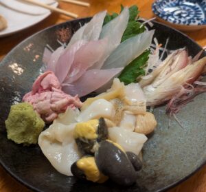 カワハギの肝付き刺身、つぶ貝刺身。鮮度良いねぇ。こりゃうまいわ。