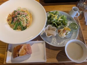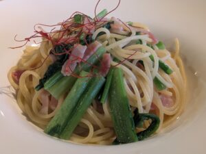 【ベーコンと高山産折り菜のオリーブオイルパスタ】はちょい緩めの茹で加減だったが、味は美味しかった。