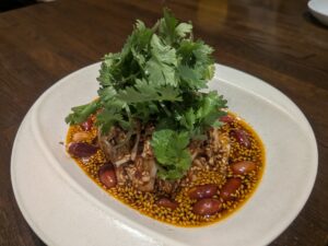 先ずはパクチー盛りだくさんのよだれ鶏。パクチーは私が回収し、美味しくいただきました。よだれ鶏の刺激的な辛さが疲れた身体に沁みるぅ。