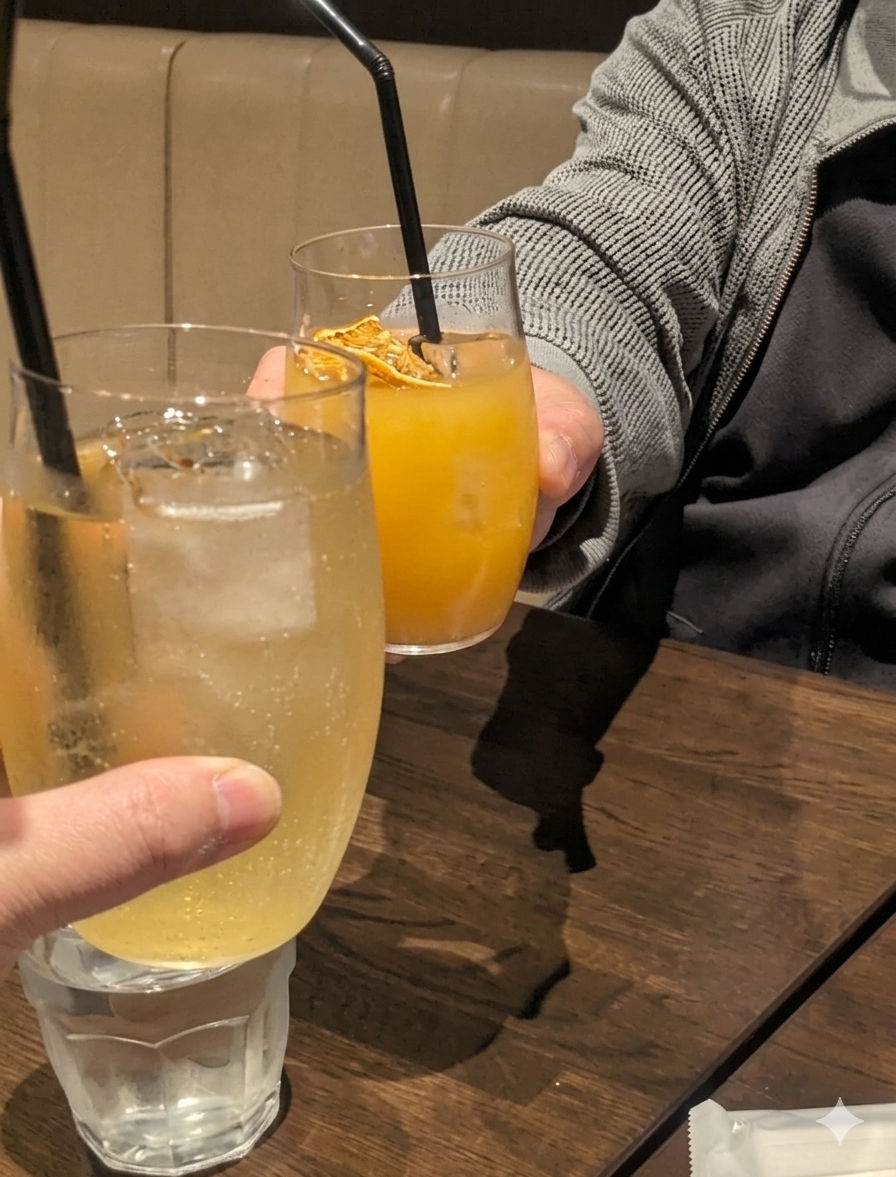 生オレンジサワーと黒烏龍で乾杯。オレンジ刺さってくると期待したけど絞られてた笑。